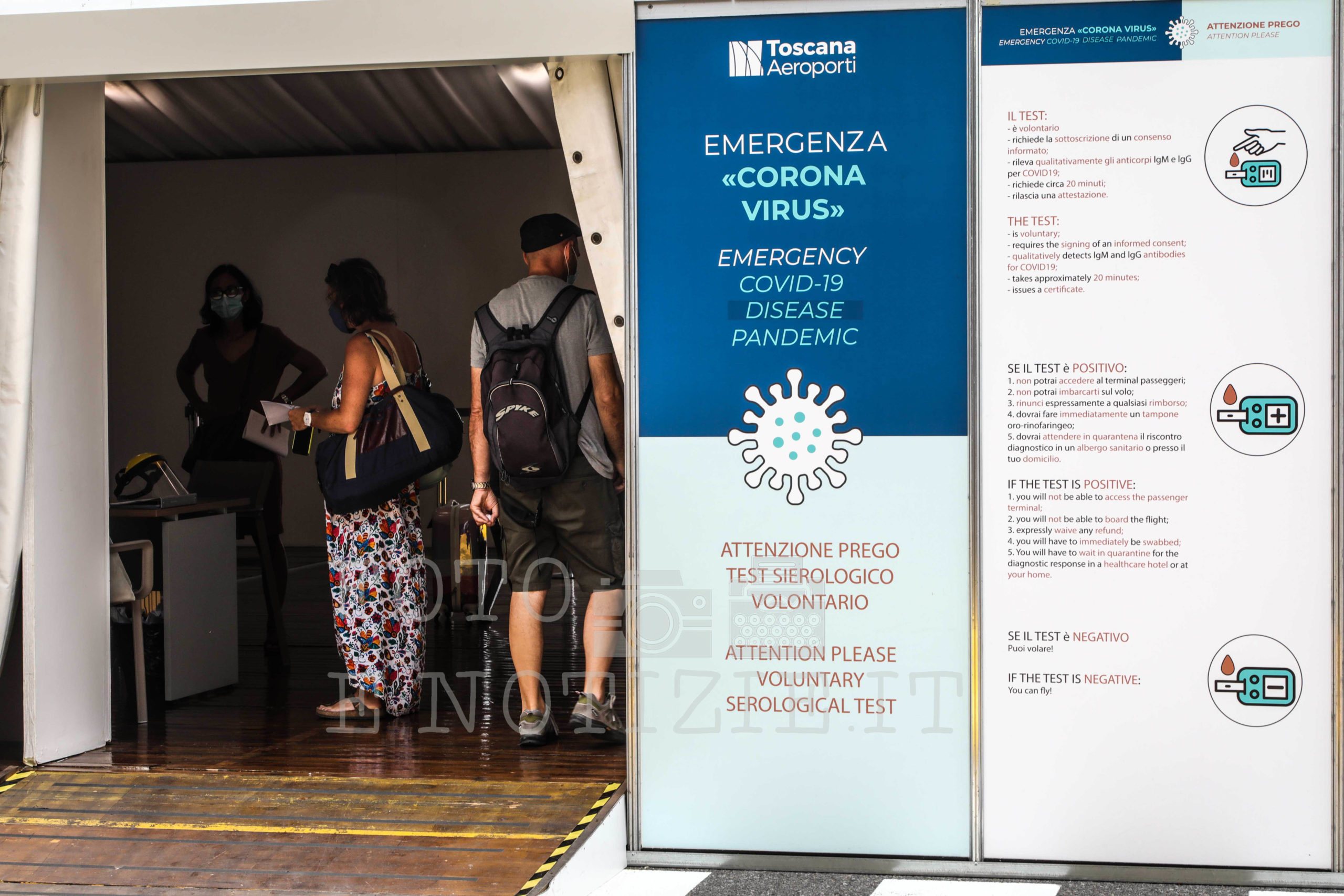 All’ingresso dell’aeroporto è stato allestito un punto prelievi dove viene offerta la possibilità di eseguire sia il test seriologico che il tampone; ambedue a totale carico del richiedente.