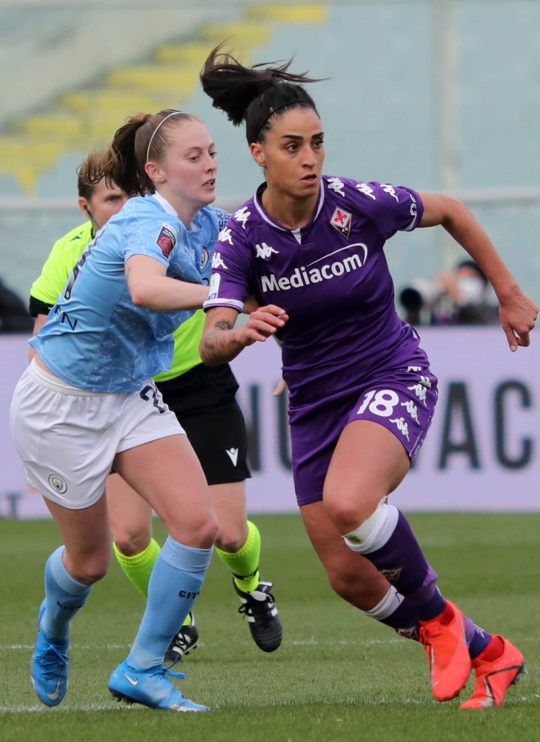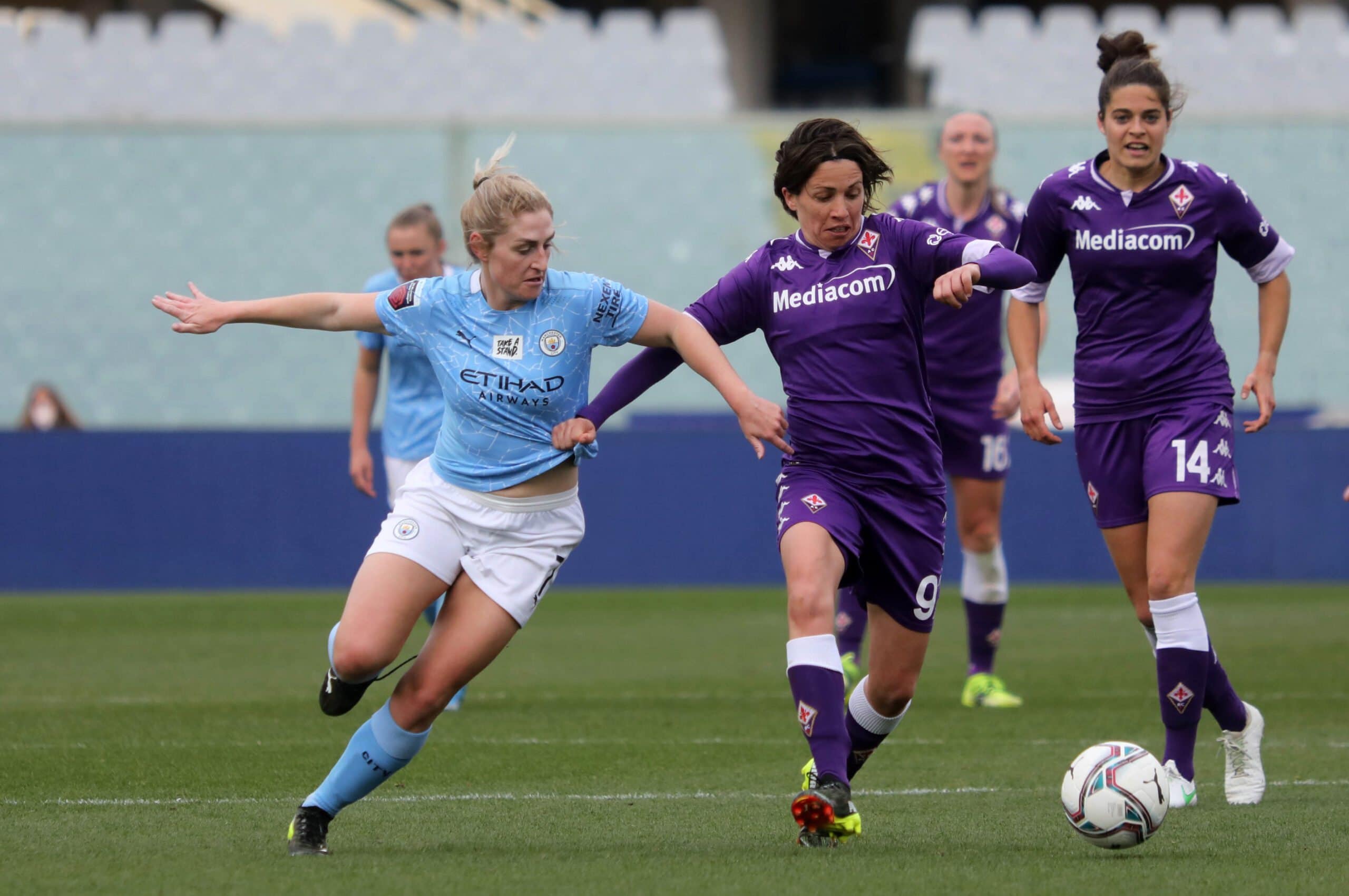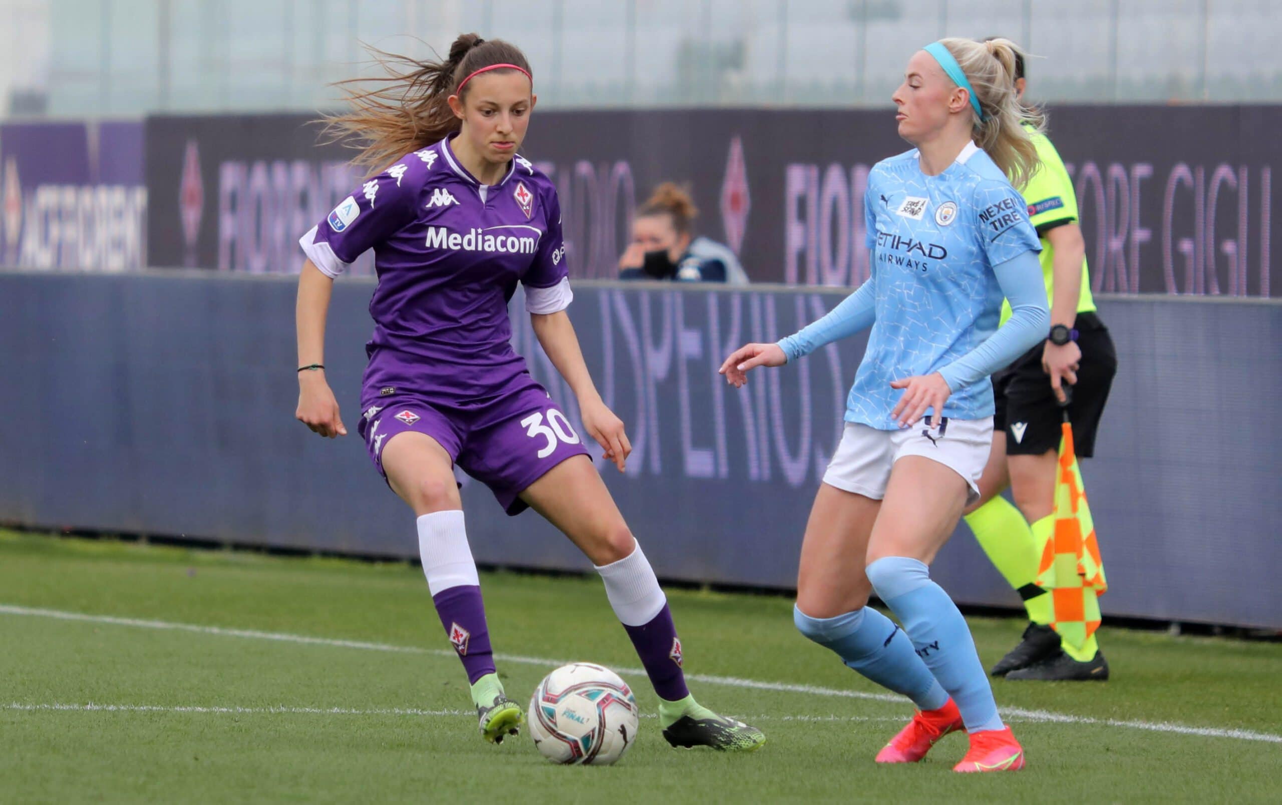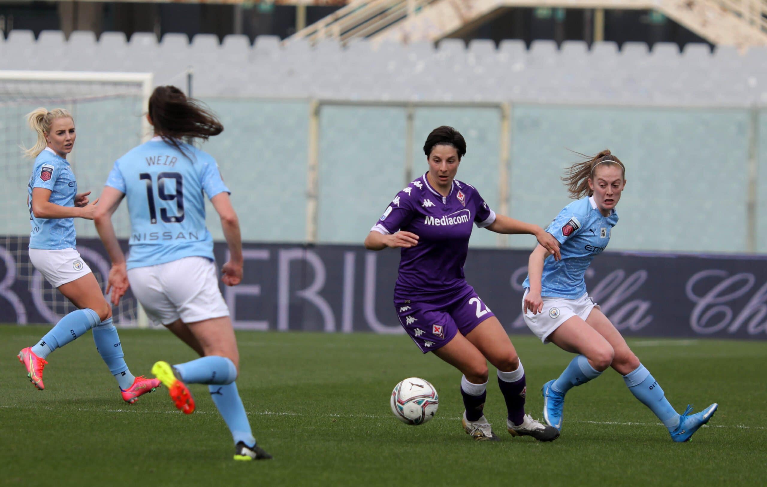 Una categoria superiore le inglesi del manchester city champions champions che dopo la vittoria casalinga per 3-0 contro le viola bastava un pareggio a reti inviolate per qualificarsi ai quarti di finale, ma la supremazia delle Inglesi (squadra favorita per il titolo finale) si è subito vista al franchi che solo dopo otto minuti passa in vantaggio con White. Dieci minuti dopo Zanoli colpisce il pallone con la mano e l’arbitro decreta calcio di rigore. Dal dischetto Weir non sbaglia. Il terzo sigillo porta ancora la firma di White che chiude la prima frazione con il punteggio di 0-3.