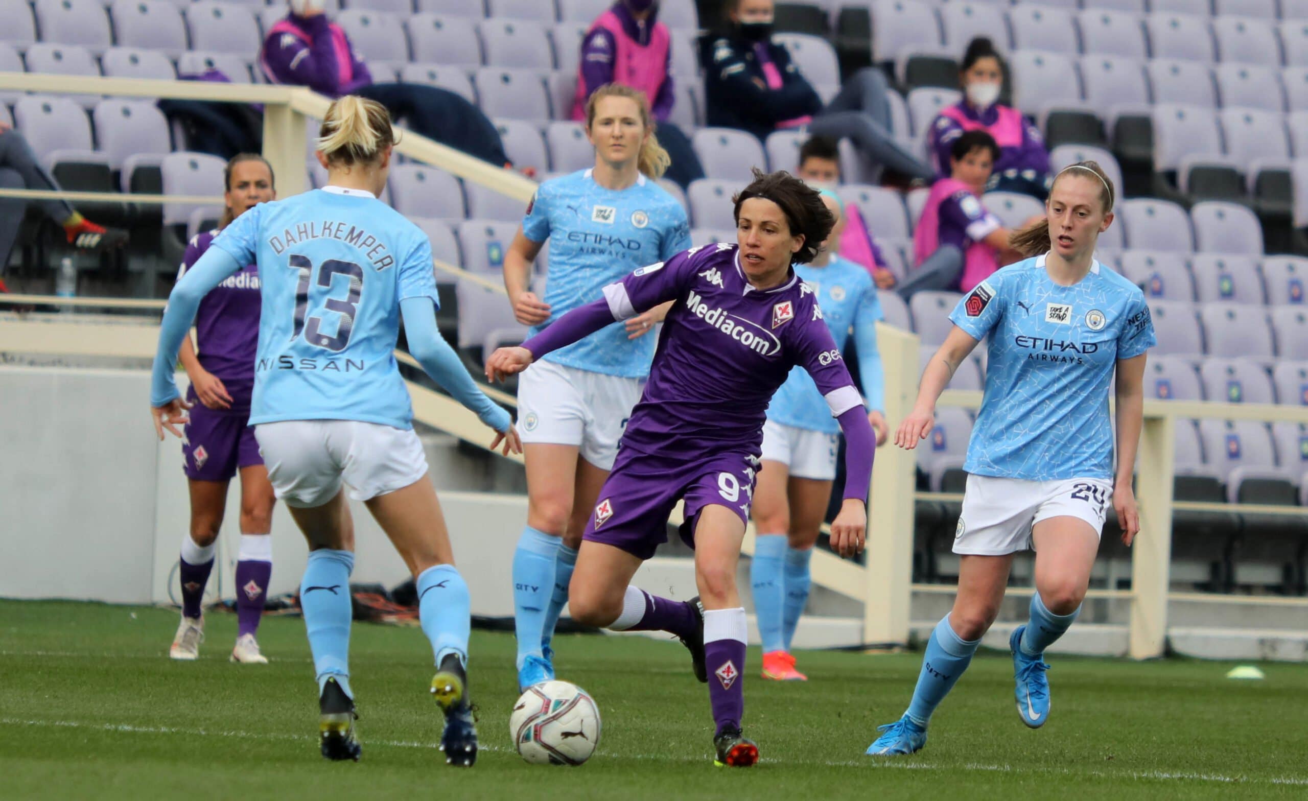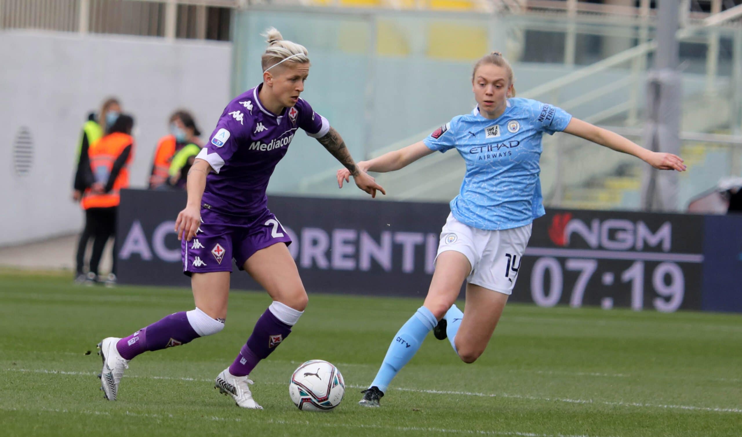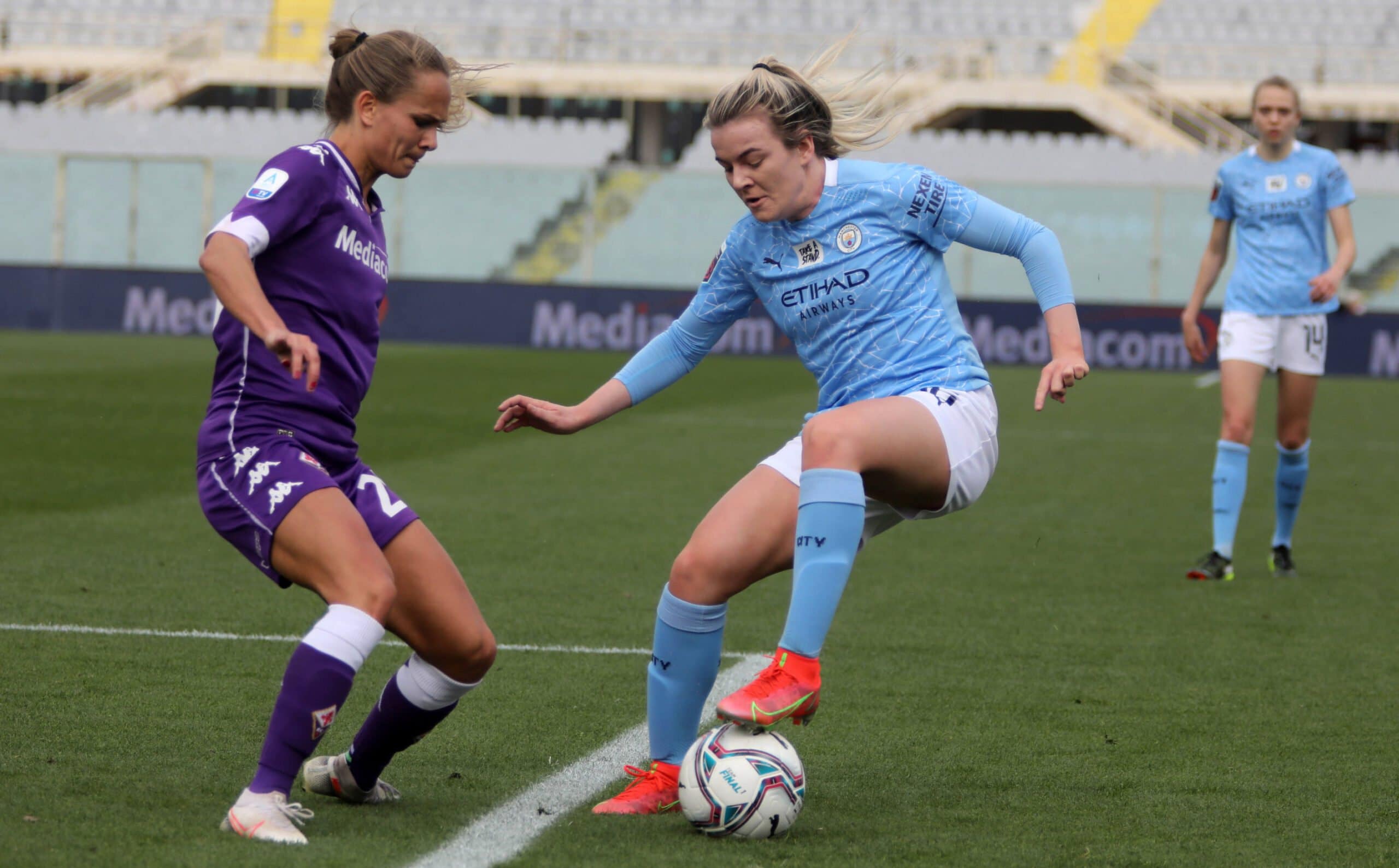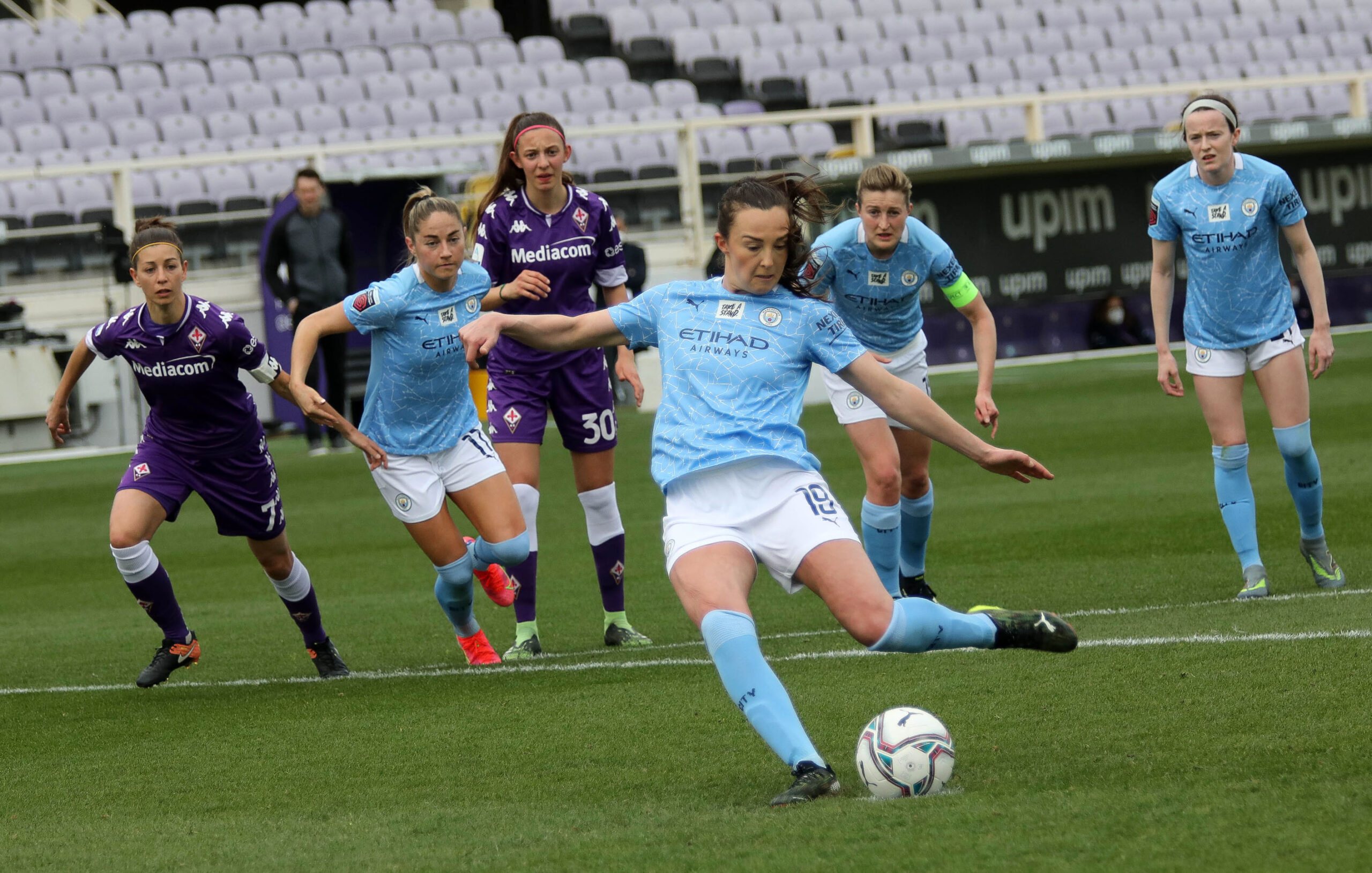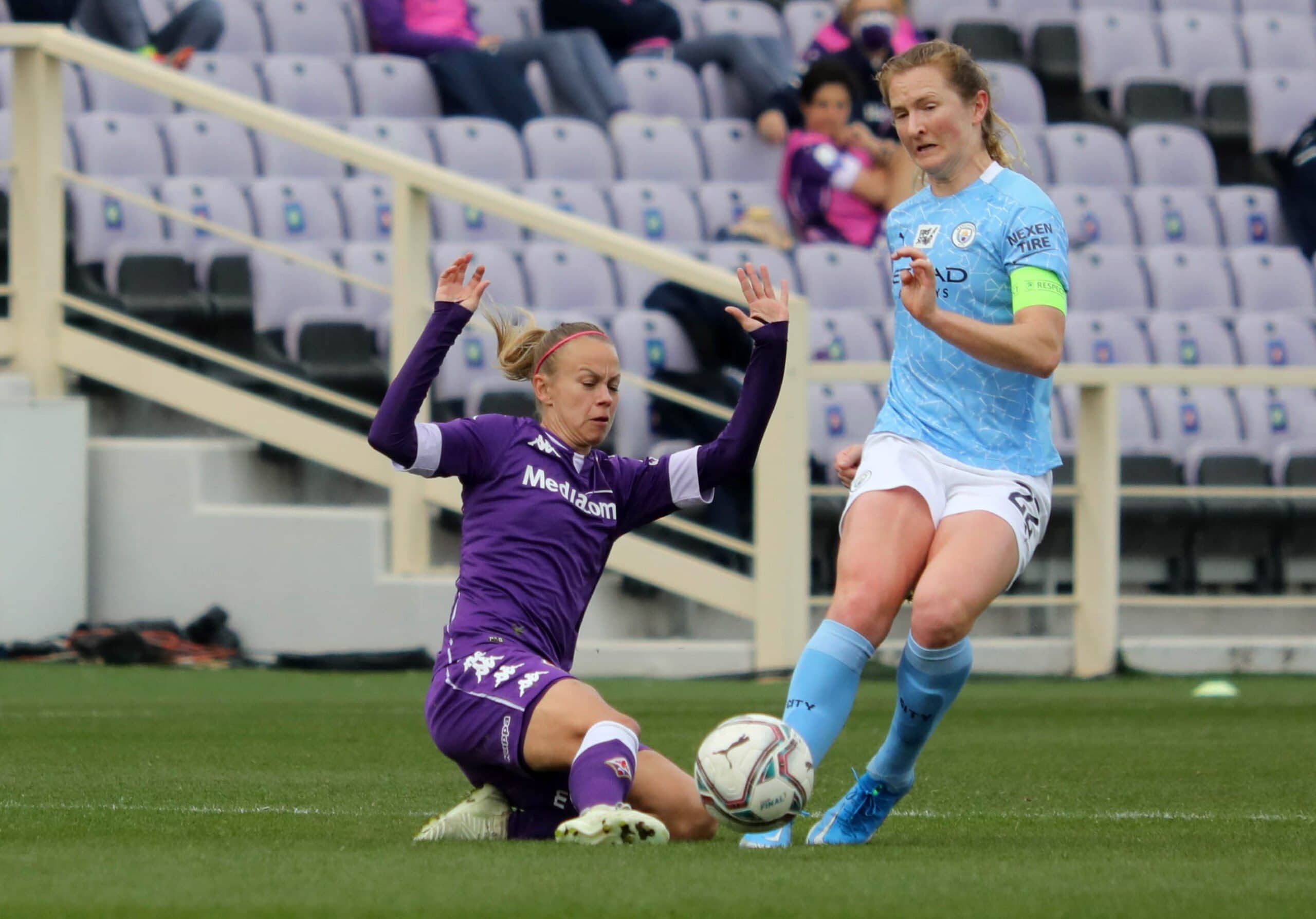 Una categoria superiore le inglesi del manchester city champions champions che dopo la vittoria casalinga per 3-0 contro le viola bastava un pareggio a reti inviolate per qualificarsi ai quarti di finale, ma la supremazia delle Inglesi (squadra favorita per il titolo finale) si è subito vista al franchi che solo dopo otto minuti passa in vantaggio con White. Dieci minuti dopo Zanoli colpisce il pallone con la mano e l’arbitro decreta calcio di rigore. Dal dischetto Weir non sbaglia. Il terzo sigillo porta ancora la firma di White che chiude la prima frazione con il punteggio di 0-3.