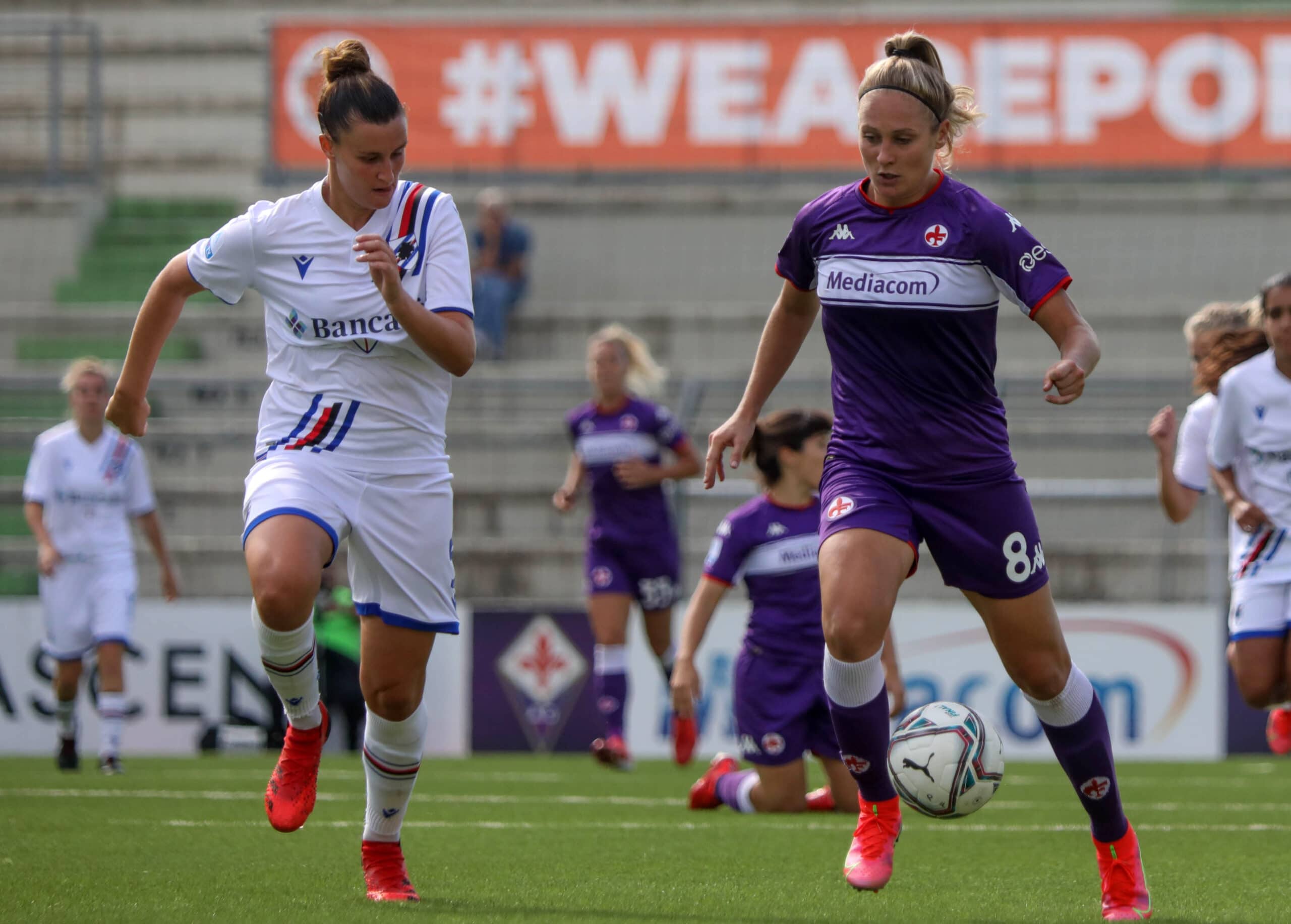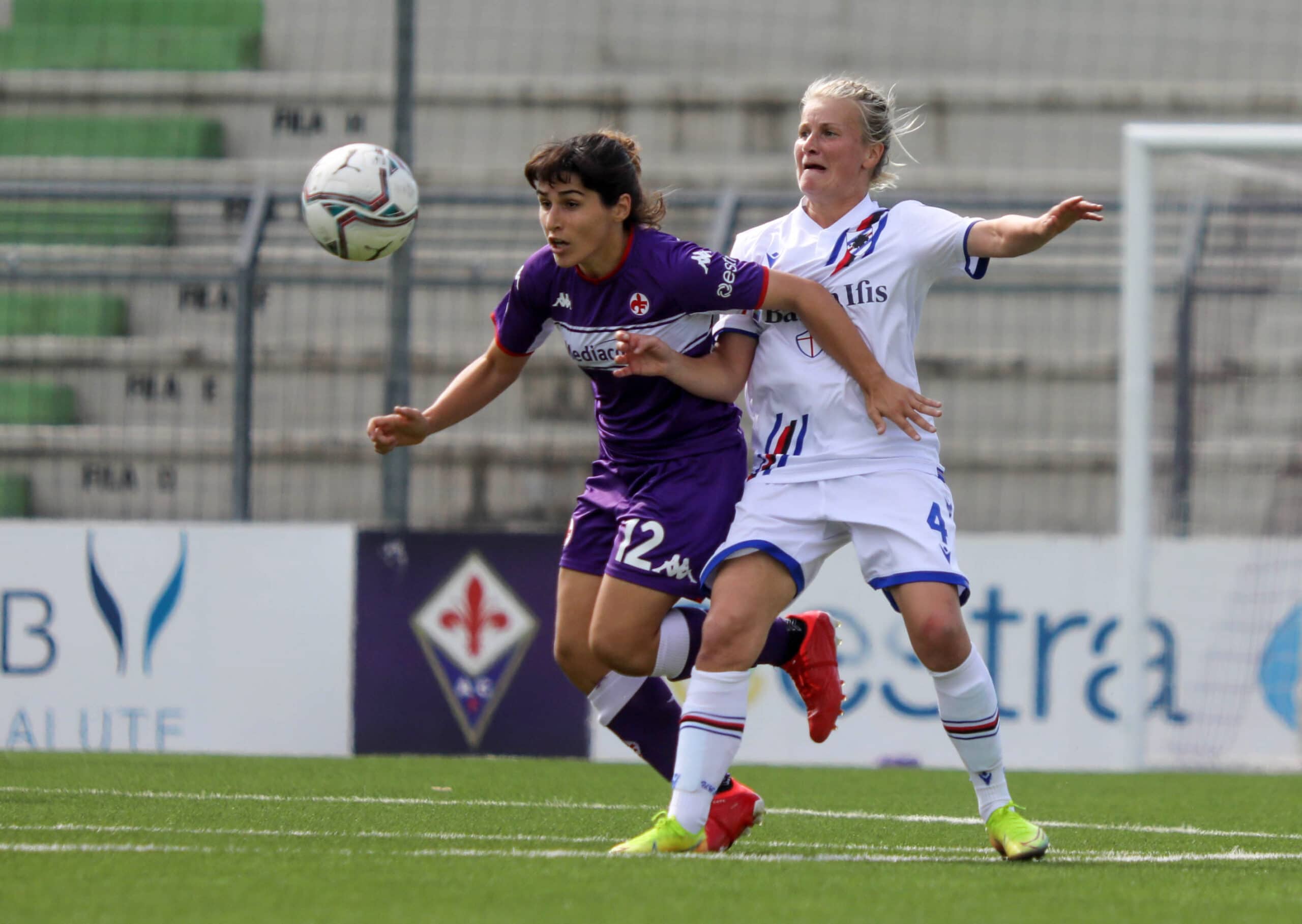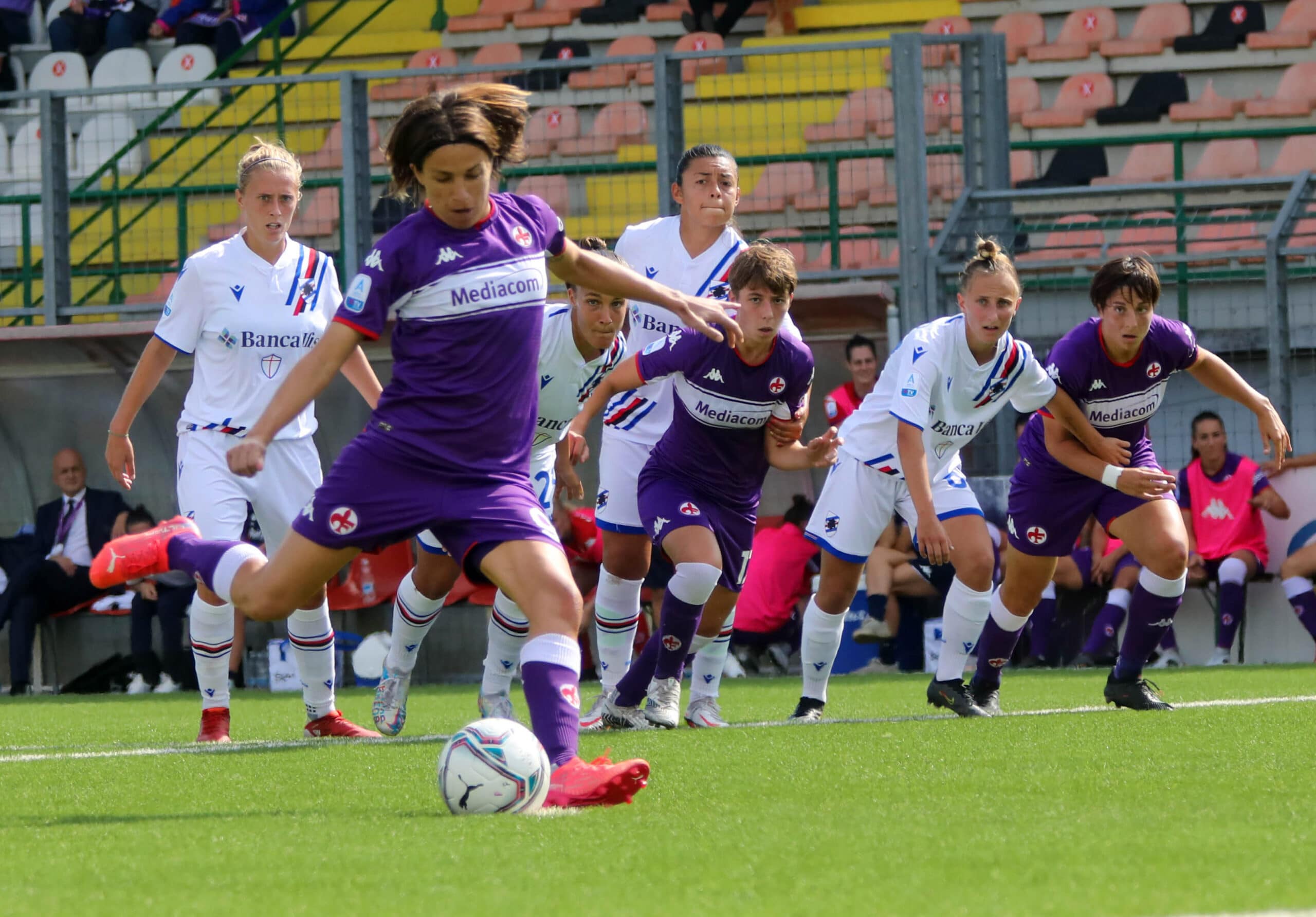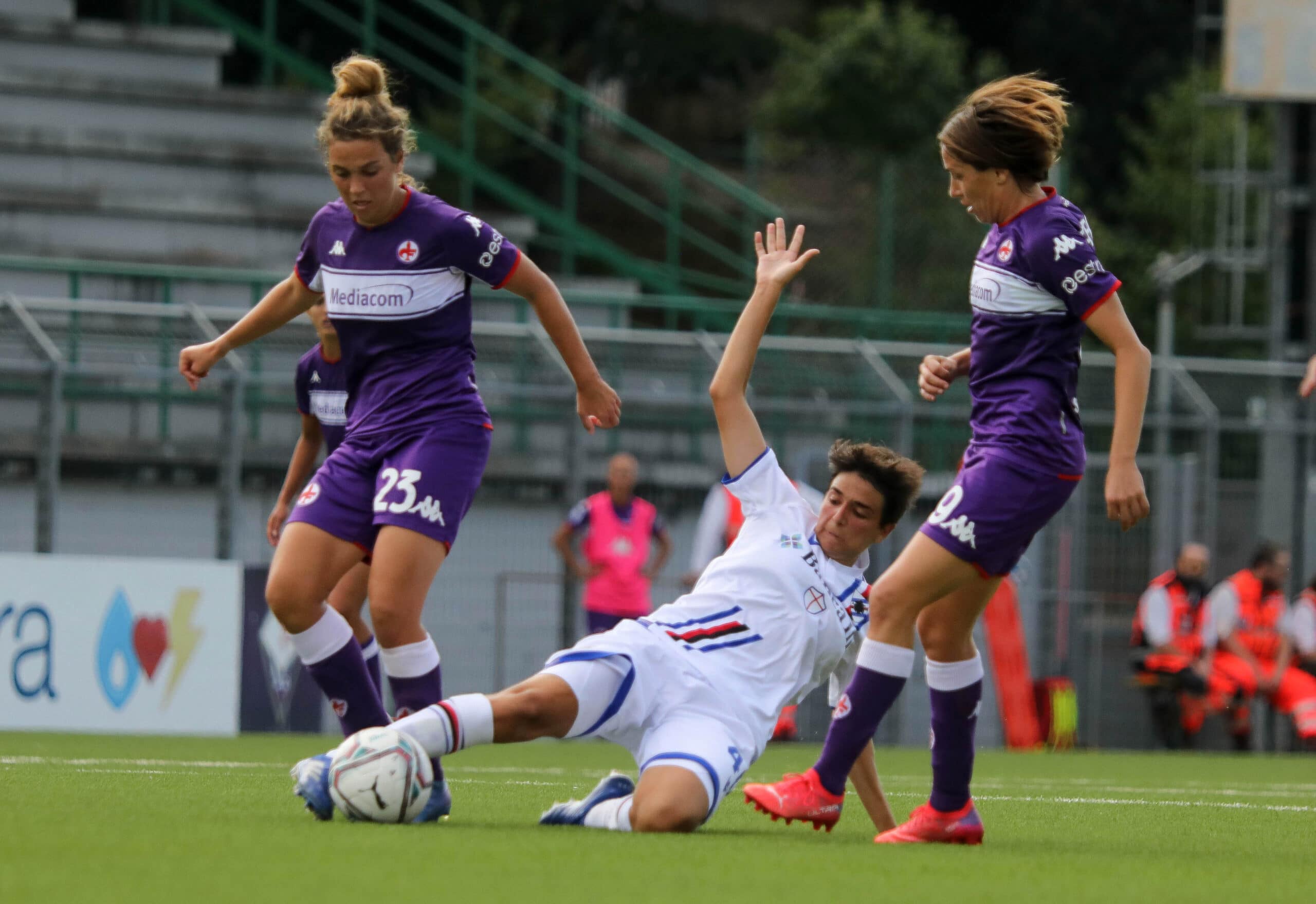 Le ospiti non si scompongono e si affacciano in attacco trovando il pareggio con Fallico che stoppa di coscia e con il mancino mette in rete. Sull’onda dell’entusiasmo le Doriane giocano un miglior calcio e impegnano più volte Schroffenegger, forse la migliore in campo della Violaoggi. Al 37’ arriva il raddoppio blucerchiato su corner grazie alla rete di Pisani. Le emozioni proseguono sul finale di frazione quando dopo un cross in area la sfortunata deviazione di Spinelli manda le squadre a riposo sul 2-2.